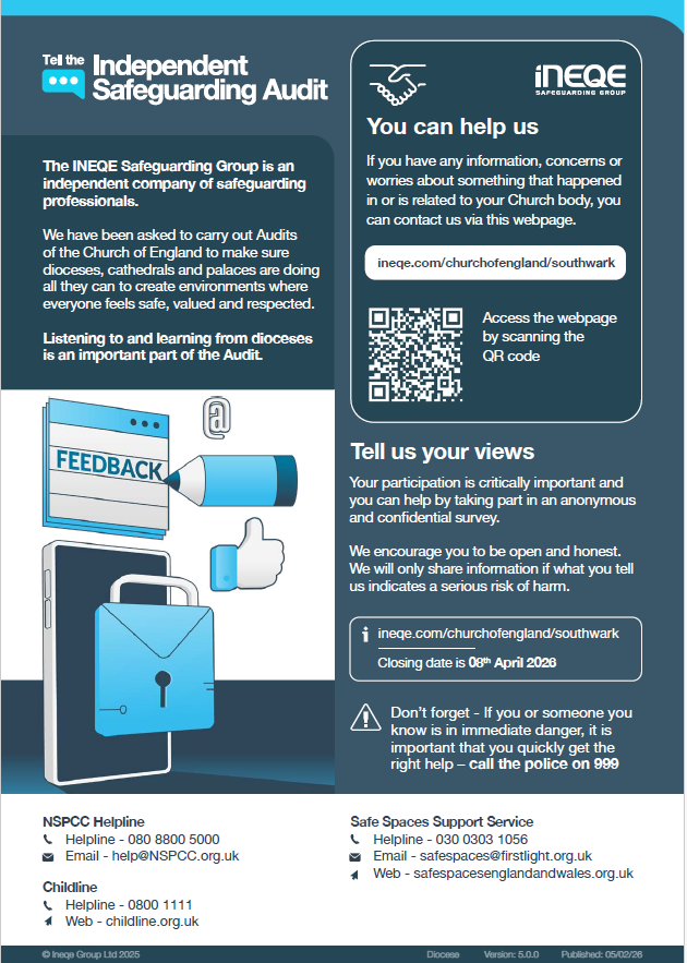 safeguarding@southwark.anglican.org - 0207 939 9441 (Mon to Fri 9am – 5pm)